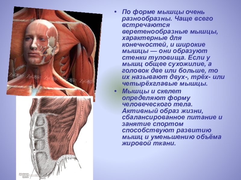 По форме мышцы очень разнообразны. Чаще всего встречаются веретенообразные мышцы, характерные для конечностей, и широкие мышцы — они