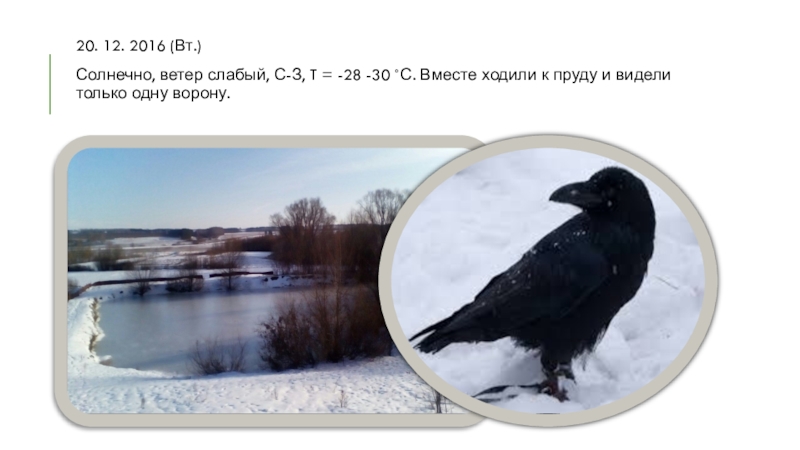 20. 12. 2016 (Вт.)Солнечно, ветер слабый, С-З, T = -28 -30 ˚С. Вместе ходили к пруду и