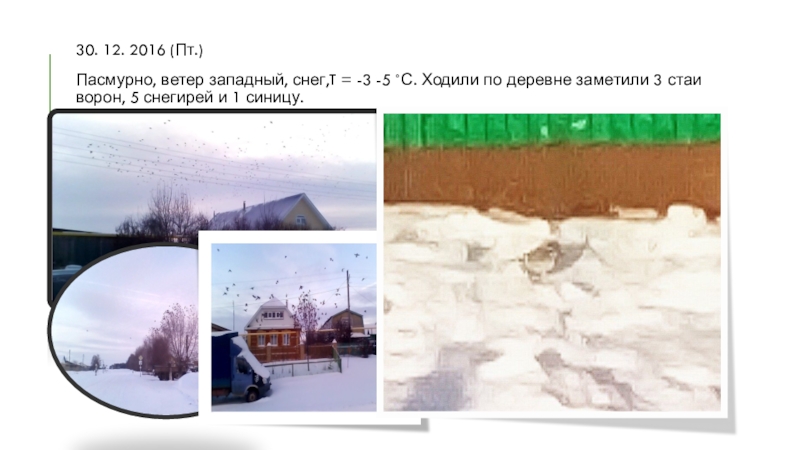 30. 12. 2016 (Пт.)Пасмурно, ветер западный, снег,T = -3 -5 ˚С. Ходили по деревне заметили 3 стаи