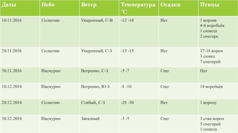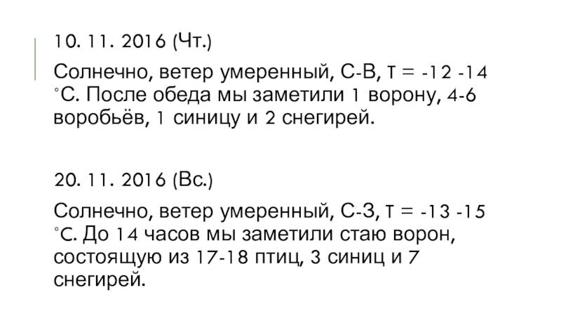 10. 11. 2016 (Чт.)Солнечно, ветер умеренный, С-В, T = -12 -14 ˚С. После обеда мы заметили 1 ворону, 4-6 воробьёв, 1 синицу и 2 снегирей.20. 11. 2016 (Вс.)Солнечно, ветер умеренный, С-З, T = -13 -15 ˚C.