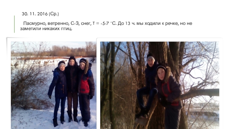 30. 11. 2016 (Ср.) Пасмурно, ветренно, С-З, снег, T = -5-7 ˚С. До 13 ч. мы ходили
