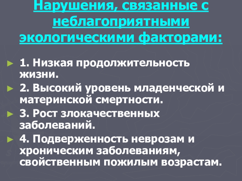 Слайд 7Нарушения, связанные с неблагоприятными экологическими факторами: