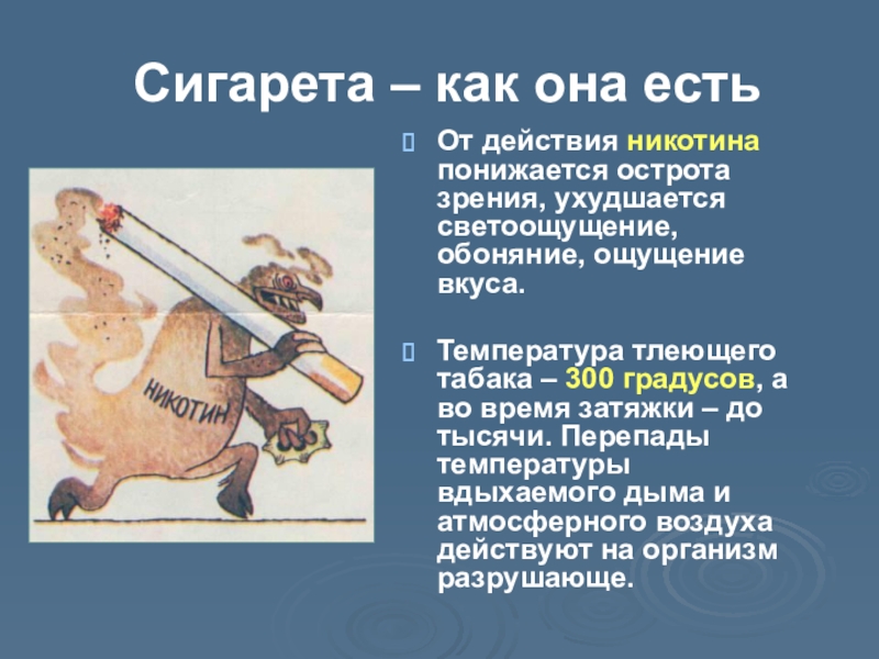 Температура тлеющего табака – 300 градусов, а во время затяжки – до тысячи. Перепады температуры вдыхаемого дыма и атмосферного воздуха действуют на организм разрушающе.