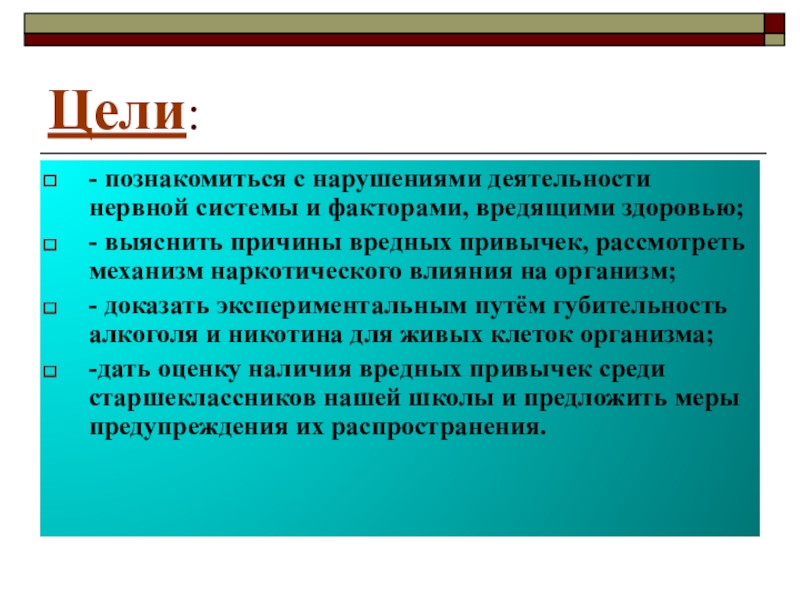 выяснить причины вредных привычек, рассмотреть механизм наркотического влияния на организм;