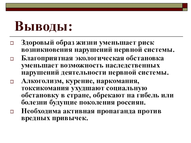 - познакомиться с нарушениями деятельности нервной системы и факторами, вредящими здоровью;