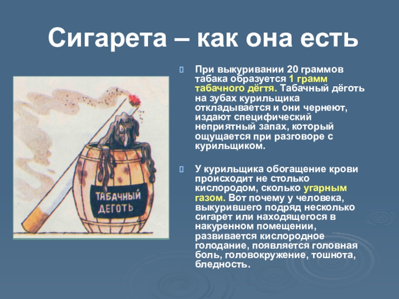 грамм табачного дёгтя. Табачный дёготь на зубах курильщика откладывается и они чернеют, издают специфический неприятный запах, который ощущается при разговоре с курильщиком.