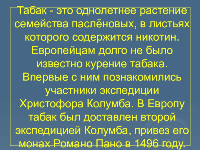 никотин. Европейцам долго не было известно курение табака. Впервые с ним познакомились участники экспедиции Христофора Колумба. В Европу табак был доставлен второй экспедицией Колумба, привез его монах Романо Пано в 1496 году.