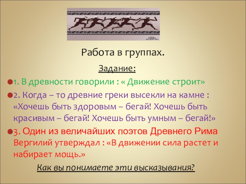 2. Когда – то древние греки высекли на камне : «Хочешь быть здоровым – бегай! Хочешь быть красивым – бегай! Хочешь быть умным – бегай!»
