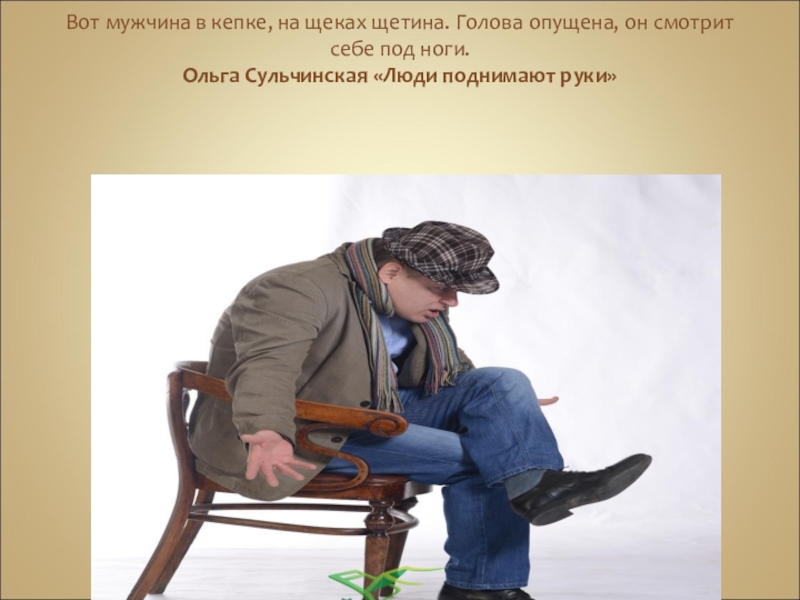 Слайд 22Вот мужчина в кепке, на щеках щетина. Голова опущена, он смотрит