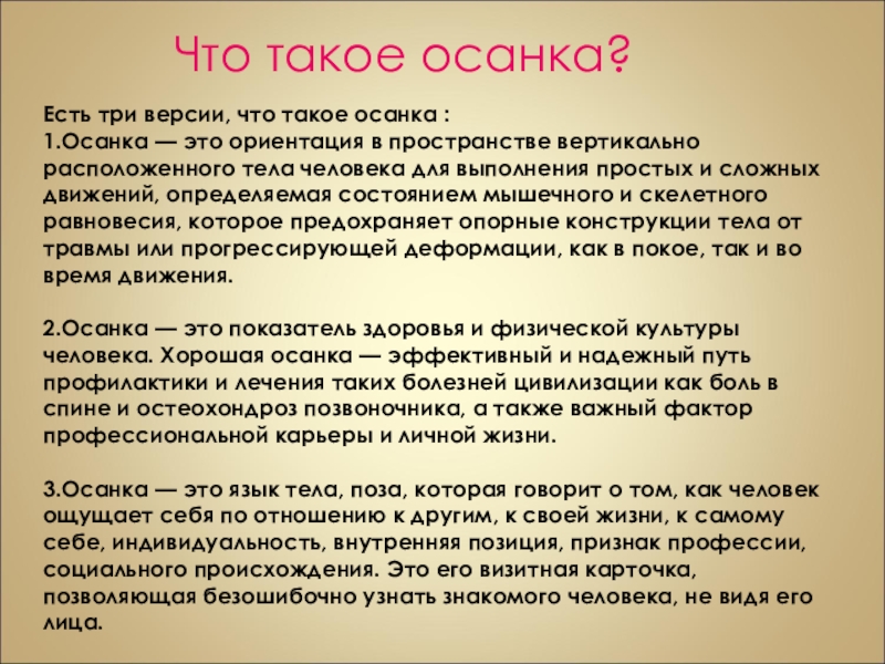 3.Осанка — это язык тела, поза, которая говорит о том, как человек ощущает себя по отношению к другим, к своей жизни, к самому себе, индивидуальность, внутренняя позиция, признак профессии, социального происхождения. Это его визитная карточка, позволяющая безошибочно узнать знакомого человека, не видя его лица.