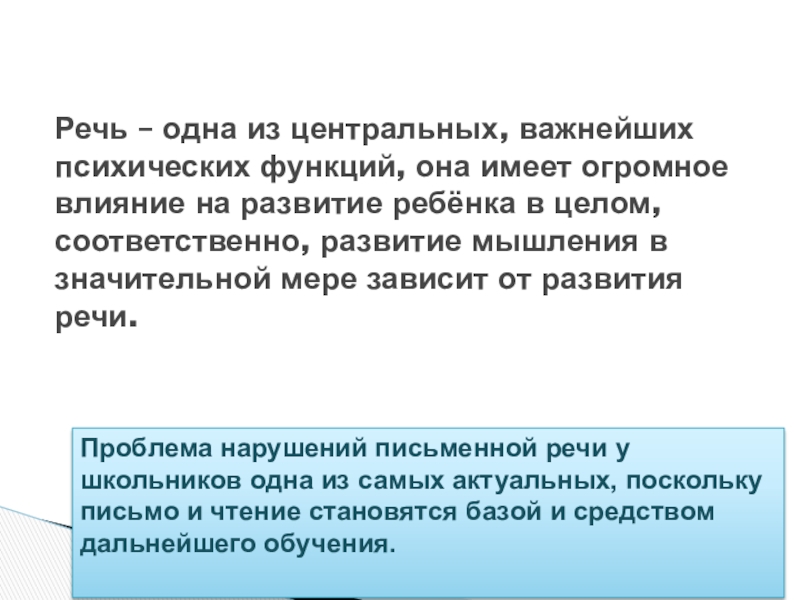 Проблема нарушений письменной речи у школьников одна из самых актуальных, поскольку письмо и чтение становятся базой и средством дальнейшего обучения.