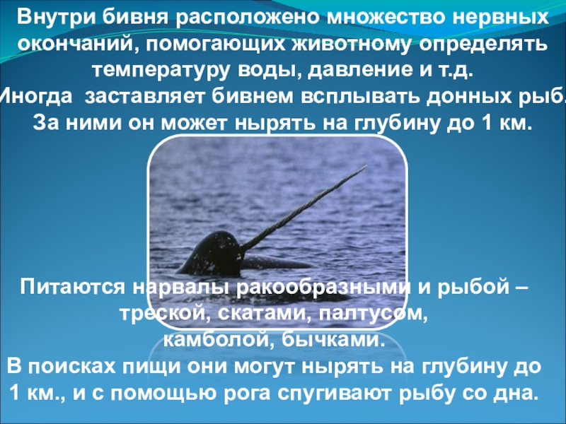 Питаются нарвалы ракообразными и рыбой – треской, скатами, палтусом,