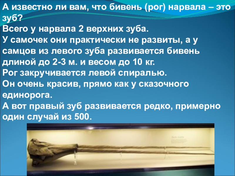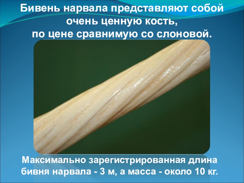 бивня нарвала - 3 м, а масса - около 10 кг.