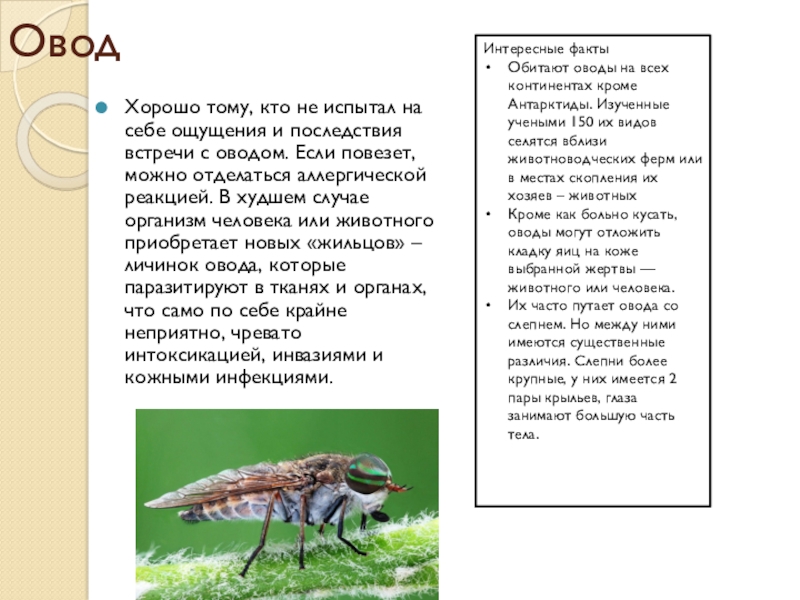Кроме как больно кусать, оводы могут отложить кладку яиц на коже выбранной жертвы — животного или человека.