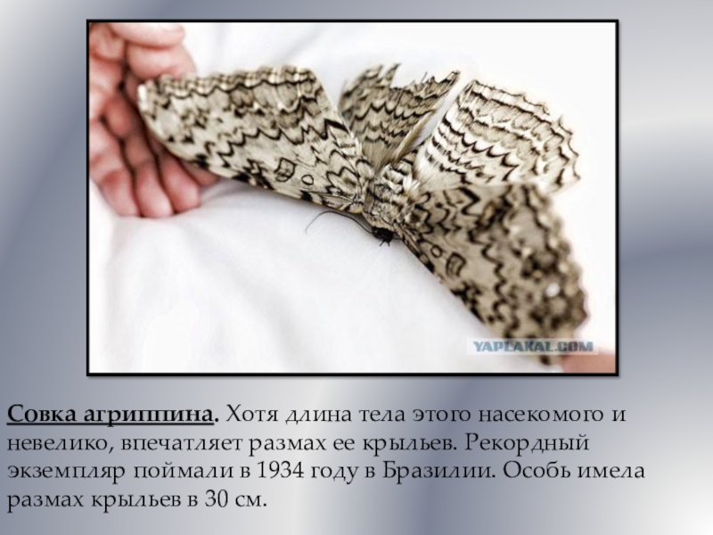 Слайд 22Совка агриппина. Хотя длина тела этого насекомого и невелико, впечатляет размах ее