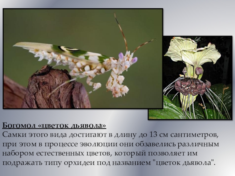 см сантиметров, при этом в процессе эволюции они обзавелись различным набором естественных цветов, который позволяет им подражать типу орхидеи под названием "цветок дьявола".