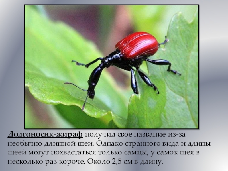 Слайд 10Долгоносик-жираф получил свое название из-за необычно длинной шеи. Однако странного вида и