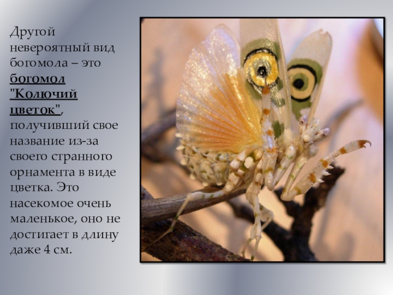 Слайд 14Другой невероятный вид богомола – это богомол "Колючий цветок", получивший свое