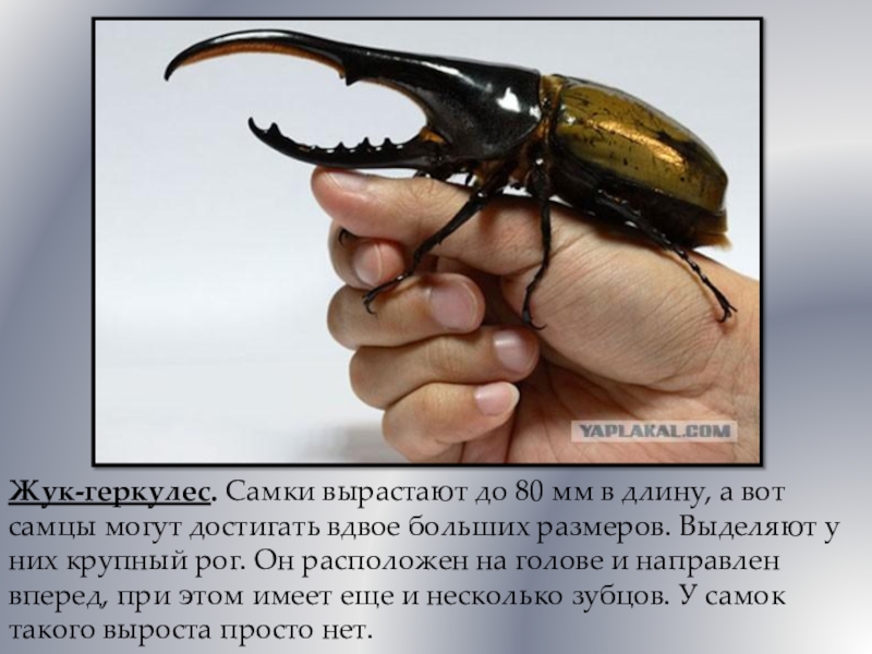 Слайд 20Жук-геркулес. Самки вырастают до 80 мм в длину, а вот самцы могут