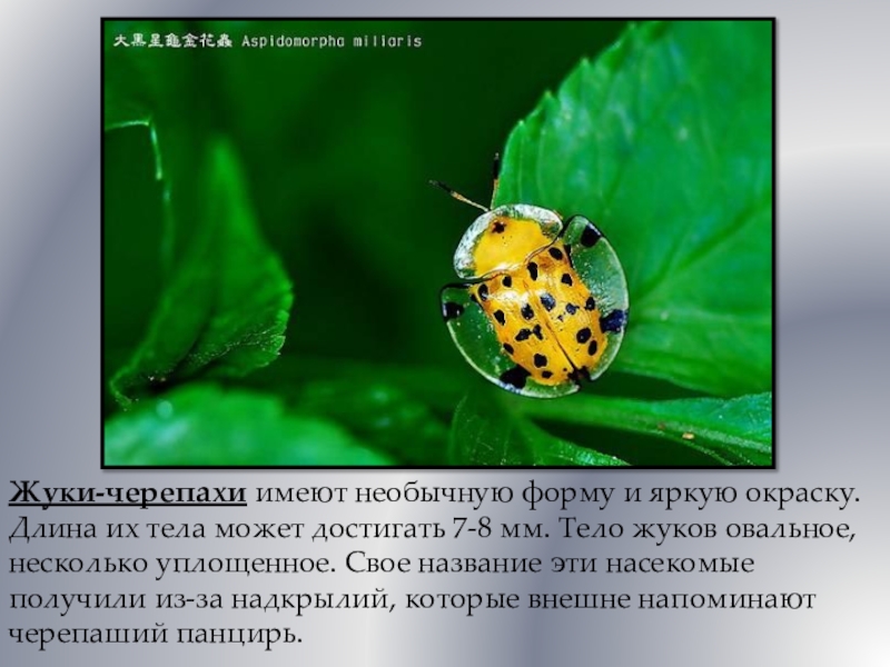 Слайд 11Жуки-черепахи имеют необычную форму и яркую окраску. Длина их тела может достигать