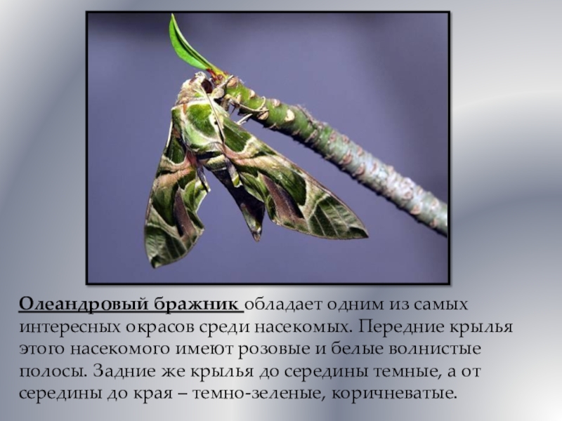 Слайд 12Олеандровый бражник обладает одним из самых интересных окрасов среди насекомых. Передние