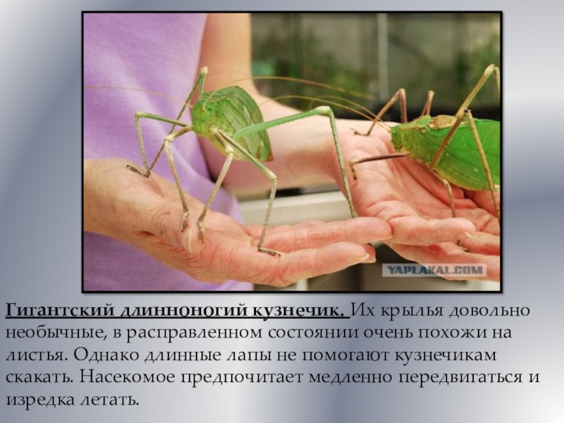 Слайд 21Гигантский длинноногий кузнечик. Их крылья довольно необычные, в расправленном состоянии очень похожи