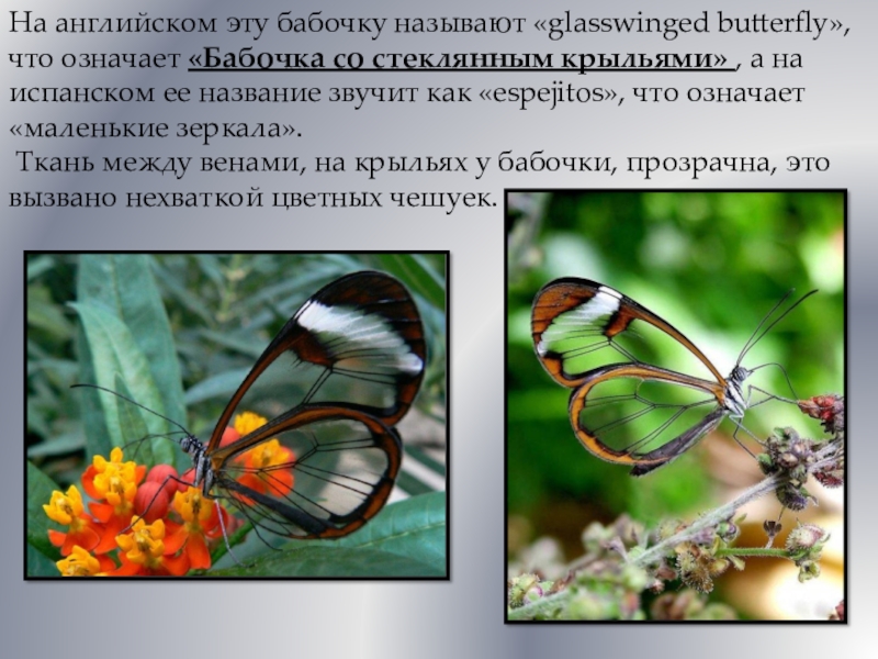 Слайд 24На английском эту бабочку называют «glasswinged butterfly», что означает «Бабочка со