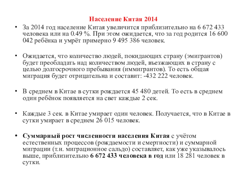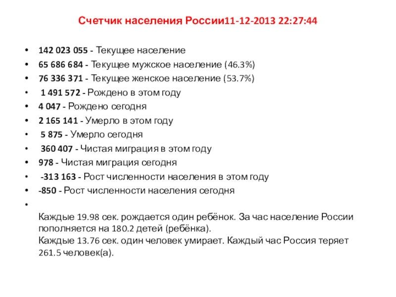 Суммарный рост численности населения России с учётом естественных процессов (рождаемости и смертности) и суммарной миграции (т.н. миграционное сальдо) составляет, как уже указывалось выше, приблизительно -332 997 человек в год или -912 человек в сутки.