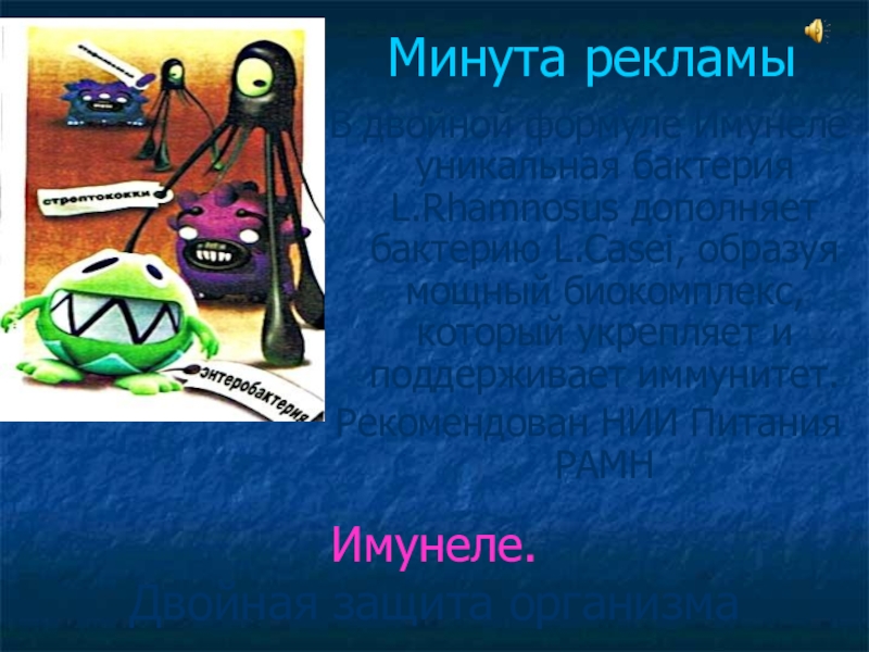 В двойной формуле Имунеле уникальная бактерия L.Rhamnosus дополняет бактерию L.Casei, образуя мощный биокомплекс, который укрепляет и поддерживает иммунитет.