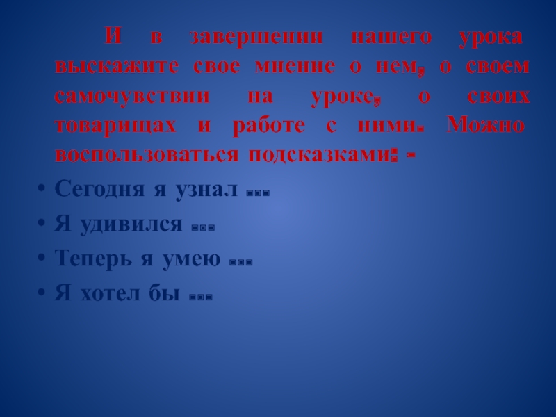 нем, о своем самочувствии на уроке, о своих товарищах и работе с ними. Можно воспользоваться подсказками: -
