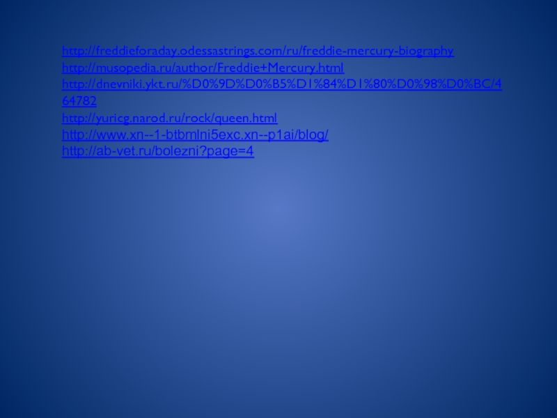 http://freddieforaday.odessastrings.com/ru/freddie-mercury-biographyhttp://musopedia.ru/author/Freddie+Mercury.htmlhttp://dnevniki.ykt.ru/%D0%9D%D0%B5%D1%84%D1%80%D0%98%D0%BC/464782http://yuricg.narod.ru/rock/queen.htmlhttp://www.xn--1-btbmlni5exc.xn--p1ai/blog/http://ab-vet.ru/bolezni?page=4