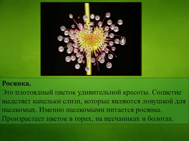 ловушкой для насекомых. Именно насекомыми питается росянка. Произрастает цветок в горах, на песчаниках и болотах.