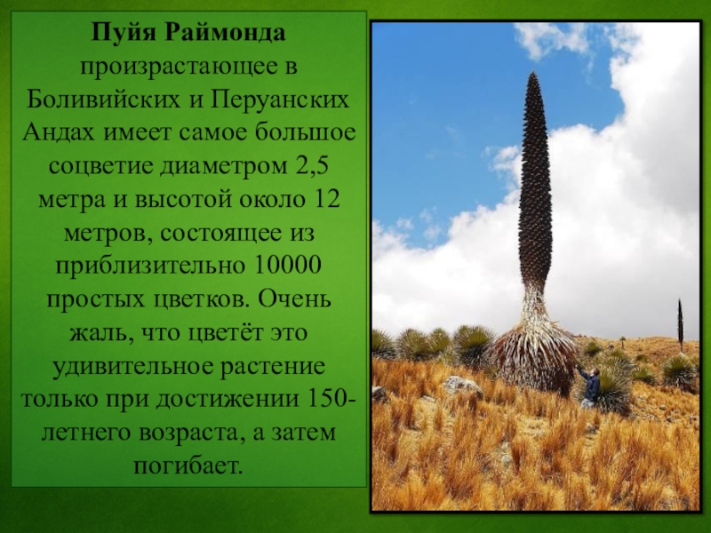 Слайд 5Пуйя Раймонда произрастающее в Боливийских и Перуанских Андах имеет самое большое