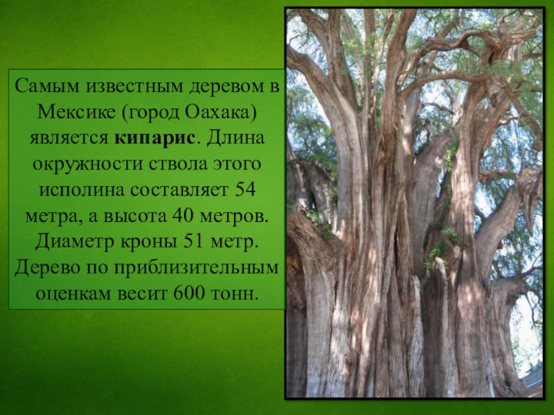 Слайд 3Самым известным деревом в Мексике (город Оахака) является кипарис. Длина окружности