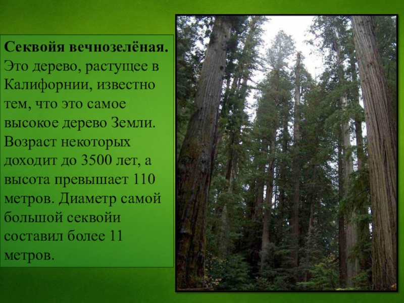 высокое дерево Земли. Возраст некоторых доходит до 3500 лет, а высота превышает 110 метров. Диаметр самой большой секвойи составил более 11 метров.