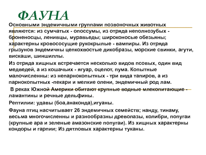 отряда неполнозубых - броненосцы, ленивцы, муравьеды; широконосые обезьяны;характерны кровососущие рукокрылые - вампиры. Из отряда грызунов эндемичны цепкохвостые дикобразы, морские свинки, агути, вискаши, шиншиллы.