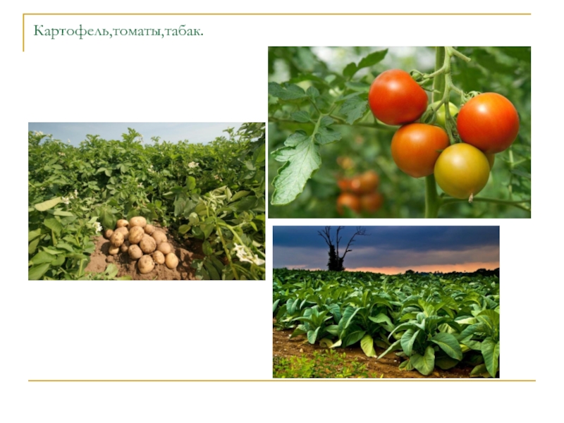 Горные страны Южной Америки- родина многих клубненосных видов картофеля, клубненосных видов кислицы, арахиса, крахмалистой кукурузы, томата, а также тыквы, южноамериканских видов перца, некоторых видов хлопчатника, хинного дерева, табака. Обыкновенный картофель происходит из Чили.