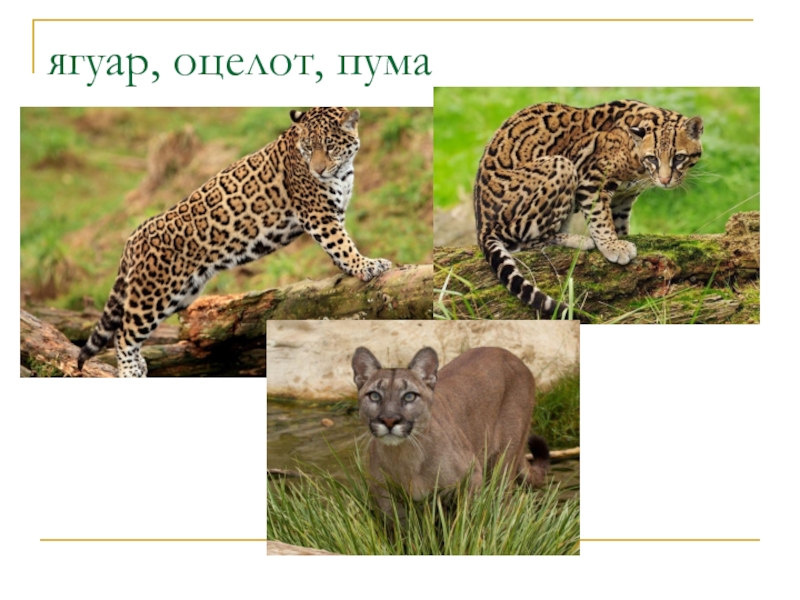 Из отряда хищных встречается несколько видов псовых, один вид медведей, а из кошачьих - ягуар, оцелот, пума. Копытные малочисленны: из непарнокопытных - три вида тапиров, а из парнокопытных -пекари и мелкие олени, эндемичный род лам.