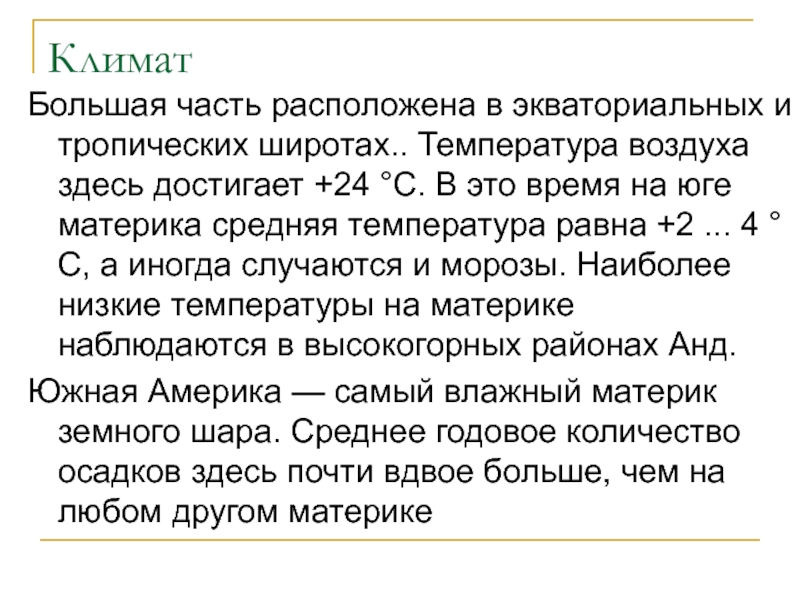 достигает +24 °С. В это время на юге материка средняя температура равна +2 ... 4 °С, а иногда случаются и морозы. Наиболее низкие температуры на материке наблюдаются в высокогорных районах Анд.