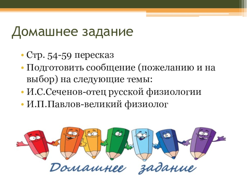 Домашнее заданиеСтр. 54-59 пересказПодготовить сообщение (пожеланию и на выбор) на следующие темы:И.С.Сеченов-отец русской физиологииИ.П.Павлов-великий физиолог