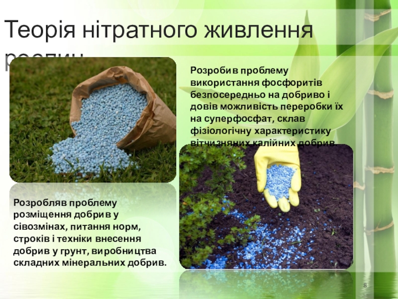Розробив проблему використання фосфоритів безпосередньо на добриво і довів можливість переробки їх на суперфосфат, склав фізіологічну характеристику вітчизняних калійних добрив.