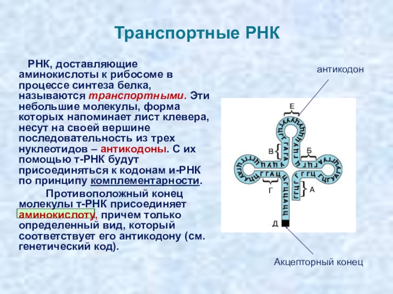 процессе синтеза белка, называются транспортными. Эти небольшие молекулы, форма которых напоминает лист клевера, несут на своей вершине последовательность из трех нуклеотидов – антикодоны. С их помощью т-РНК будут присоединяться к кодонам и-РНК по принципу комплементарности.