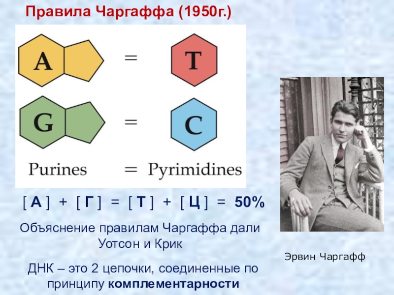 [ А ] + [ Г ] = [ Т ] + [ Ц ] = 50%