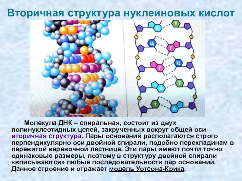 ДНК – спиральная, состоит из двух полинуклеотидных цепей, закрученных вокруг общей оси – вторичная структура. Пары оснований располагаются строго перпендикулярно оси двойной спирали, подобно перекладинам в перевитой веревочной лестнице. Эти пары имеют почти точно одинаковые размеры, поэтому в структуру двойной спирали «вписываются» любые последовательности пар оснований. Данное строение и отражает модель Уотсона-Крика.