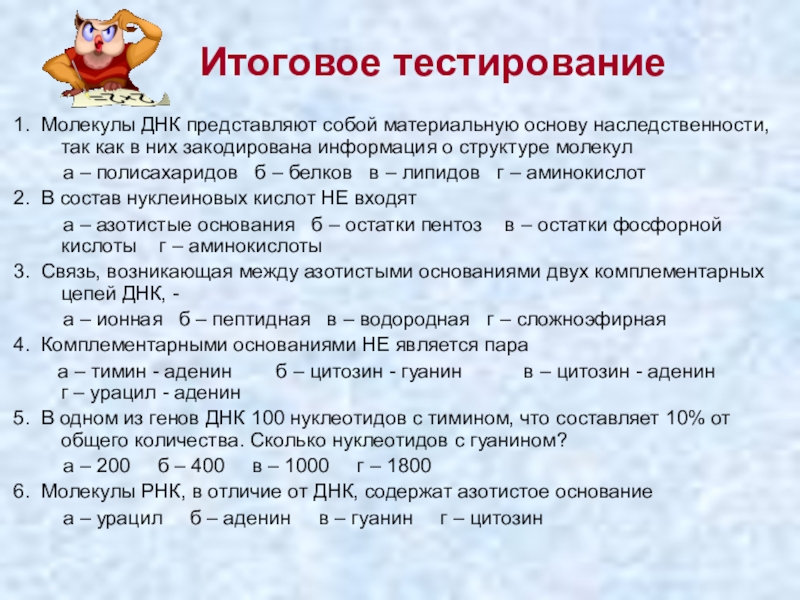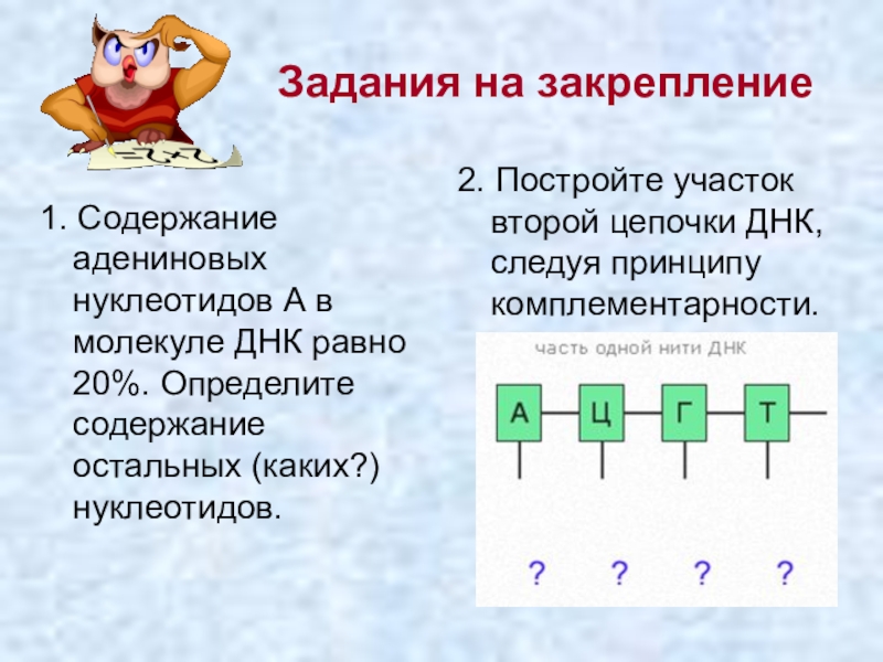 1. Содержание адениновых нуклеотидов А в молекуле ДНК равно 20%. Определите содержание остальных (каких?) нуклеотидов.
