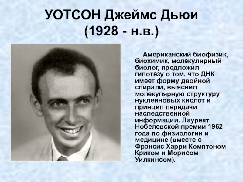 Американский биофизик, биохимик, молекулярный биолог, предложил гипотезу о том, что ДНК имеет форму двойной спирали, выяснил молекулярную структуру нуклеиновых кислот и принцип передачи наследственной информации. Лауреат Нобелевской премии 1962 года по физиологии и медицине (вместе с Фрэнсис Харри Комптоном Криком и Морисом Уилкинсом).