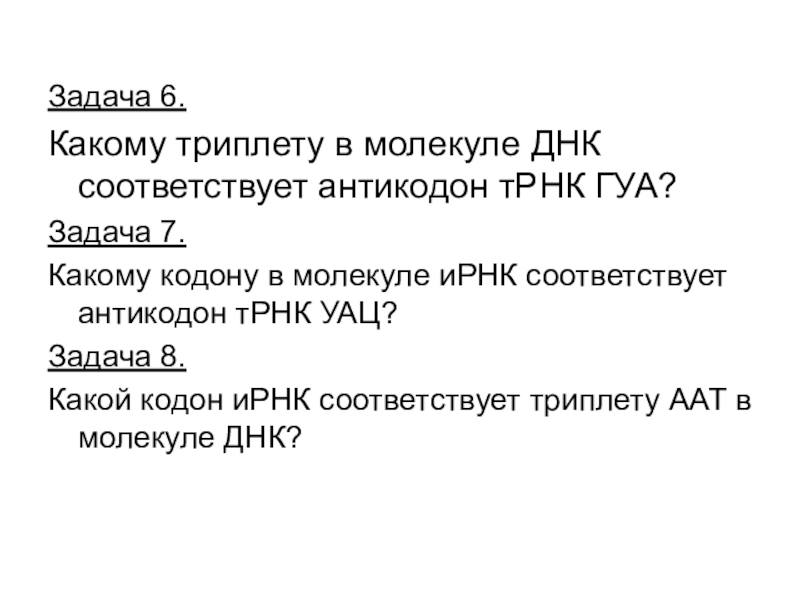 Задача 6.Какому триплету в молекуле ДНК соответствует антикодон тРНК ГУА?Задача 7.Какому кодону в молекуле иРНК соответствует антикодон