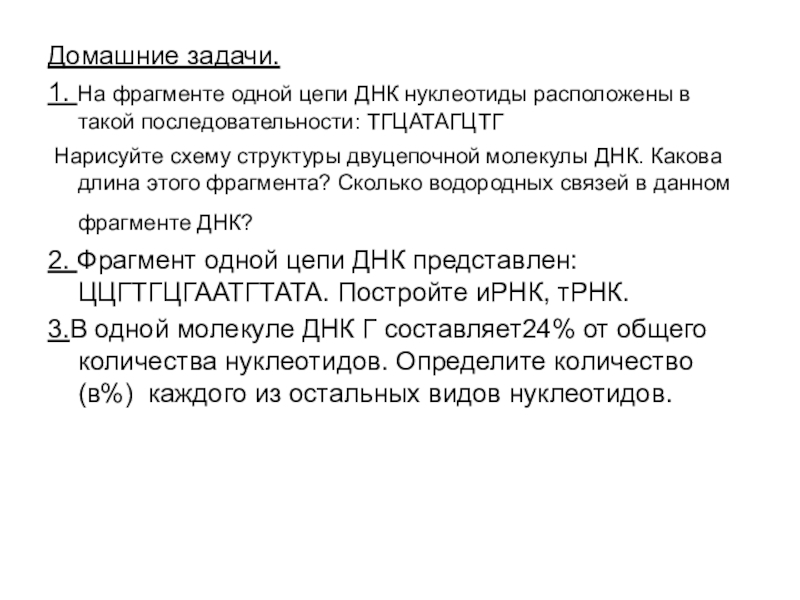 Домашние задачи.1. На фрагменте одной цепи ДНК нуклеотиды расположены в такой последовательности: ТГЦАТАГЦТГ Нарисуйте схему структуры двуцепочной