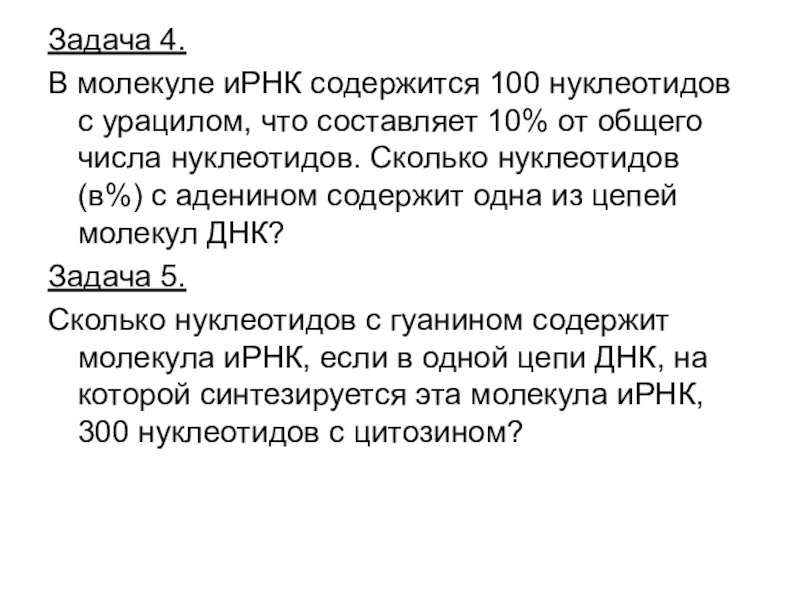 Задача 4.В молекуле иРНК содержится 100 нуклеотидов с урацилом, что составляет 10% от общего числа нуклеотидов. Сколько