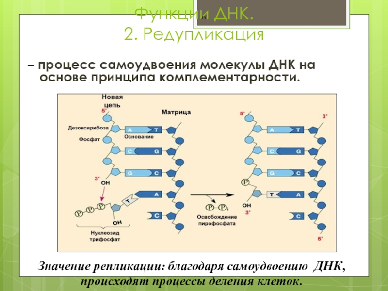 Значение репликации: благодаря самоудвоению ДНК, происходят процессы деления клеток.
